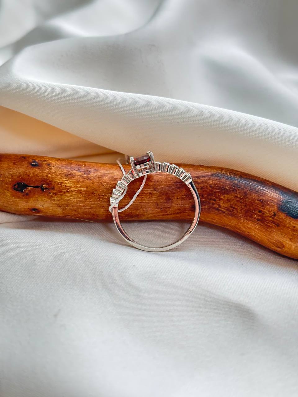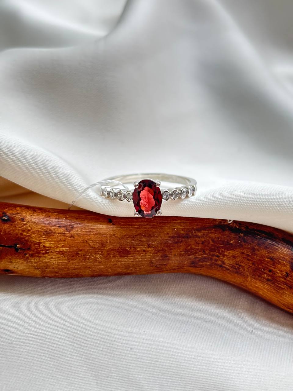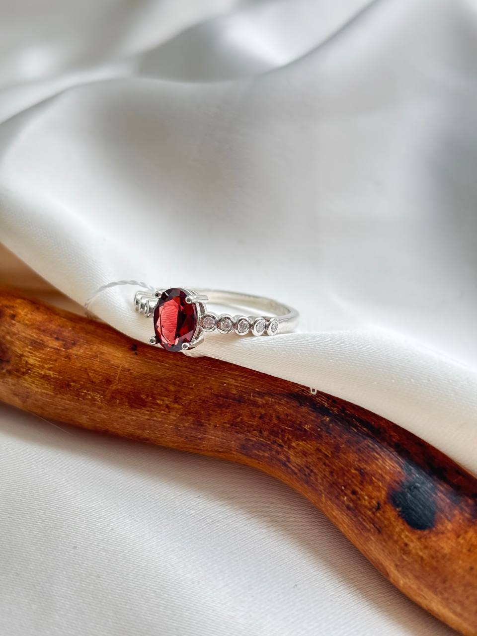 Гранат — один из древнейших самоцветов, известных человечеству. Своё название он получил за сходство с зёрнами плода гранатового дерева, символизируя жизнь, плодородие и энергию. Глубокий красный цвет этого камня веками ассоциировался с огнём, страстью и жизненной силой. В этом кольце природный гранат обработан в изысканную овальную форму, которая максимально раскрывает глубину и насыщенность его оттенка, позволяя игре света скользить по гладким граням. В паре с ним выступают фианиты — кристаллы с ярким алмазным блеском, которые выгодно подчёркивают природную красоту граната и добавляют украшению праздничное сияние.
