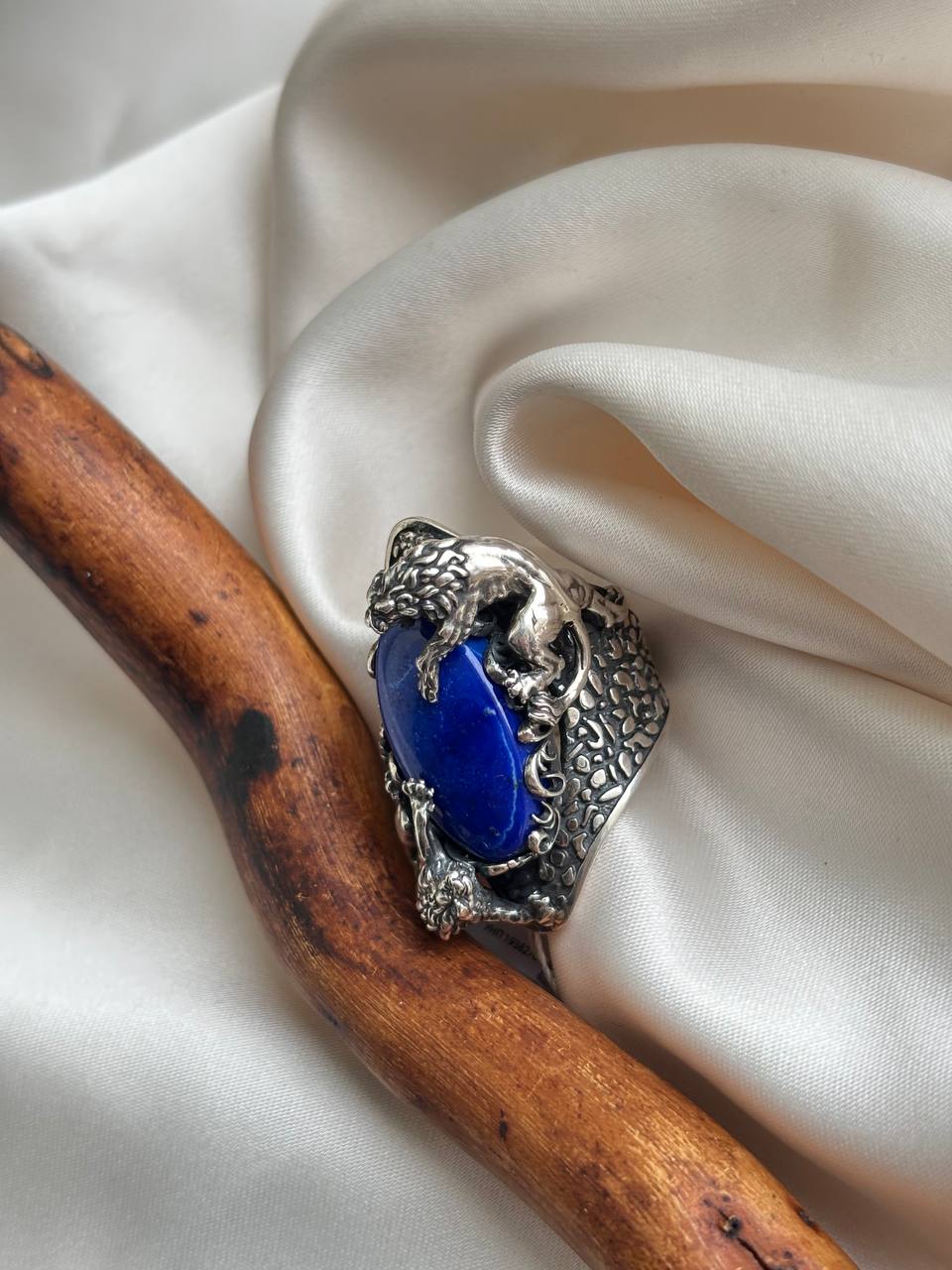 Царственная синева под охраной благородных зверей: кольцо с лазуритом и серебряными львами. Это украшение — воплощение силы, мудрости и величия, где глубокий синий камень находится под защитой царственных стражей. Овальный кабошон лазурита насыщенного синего цвета, подобного ночному небу, заключён в изысканную оправу из серебра 925 пробы, искусно выполненную в форме величественных львов. Это серебряное кольцо с лазуритом и львами в классическом дизайне станет вашим талисманом власти, уверенности и внутренней гармонии, подчеркивая силу духа и благородство своей обладательницы.