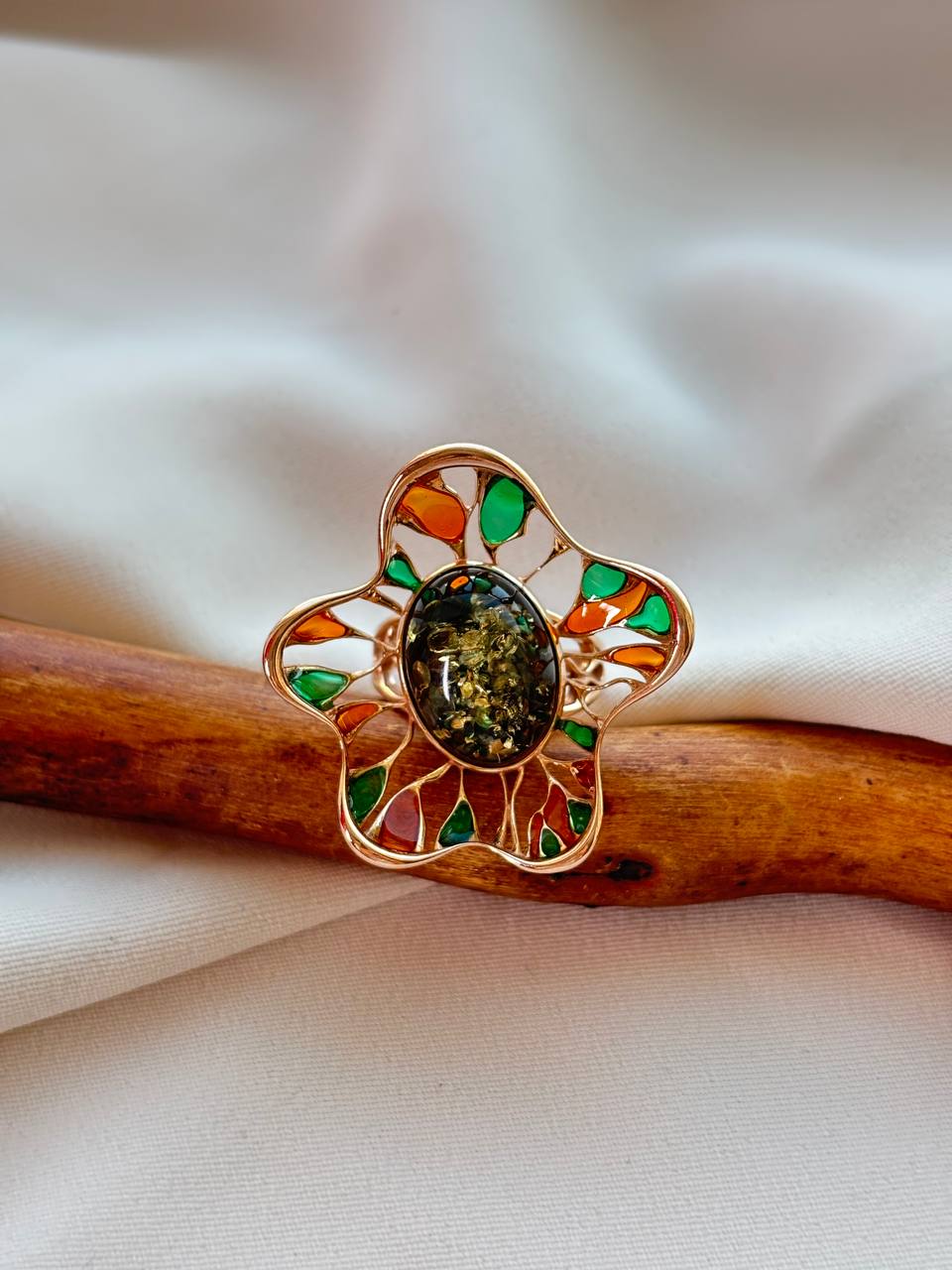 Утренняя роса на пальце: кольцо с зеленым янтарем. Это украшение — словно частичка оживающего леса, заключенная в элегантную оправу. Свежий, умиротворяющий оттенок камня напоминает о весенней листве, тихой глубине озера или первом луче солнца в тенистом саду. Кольцо из зеленого янтаря в обрамлении серебра 925 пробы с позолотой станет символом вашей связи с природой, даря ощущение гармонии, свежести и обновления. Его сдержанная красота и уникальный цвет делают его идеальным акцентом как для романтичного, так и для повседневного образа. Элегантное кольцо с янтарем-кабошоном — это авторская работа, где каждый камень неповторим, как отпечаток времени.
