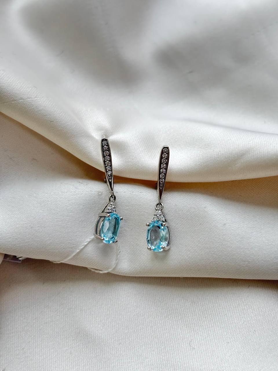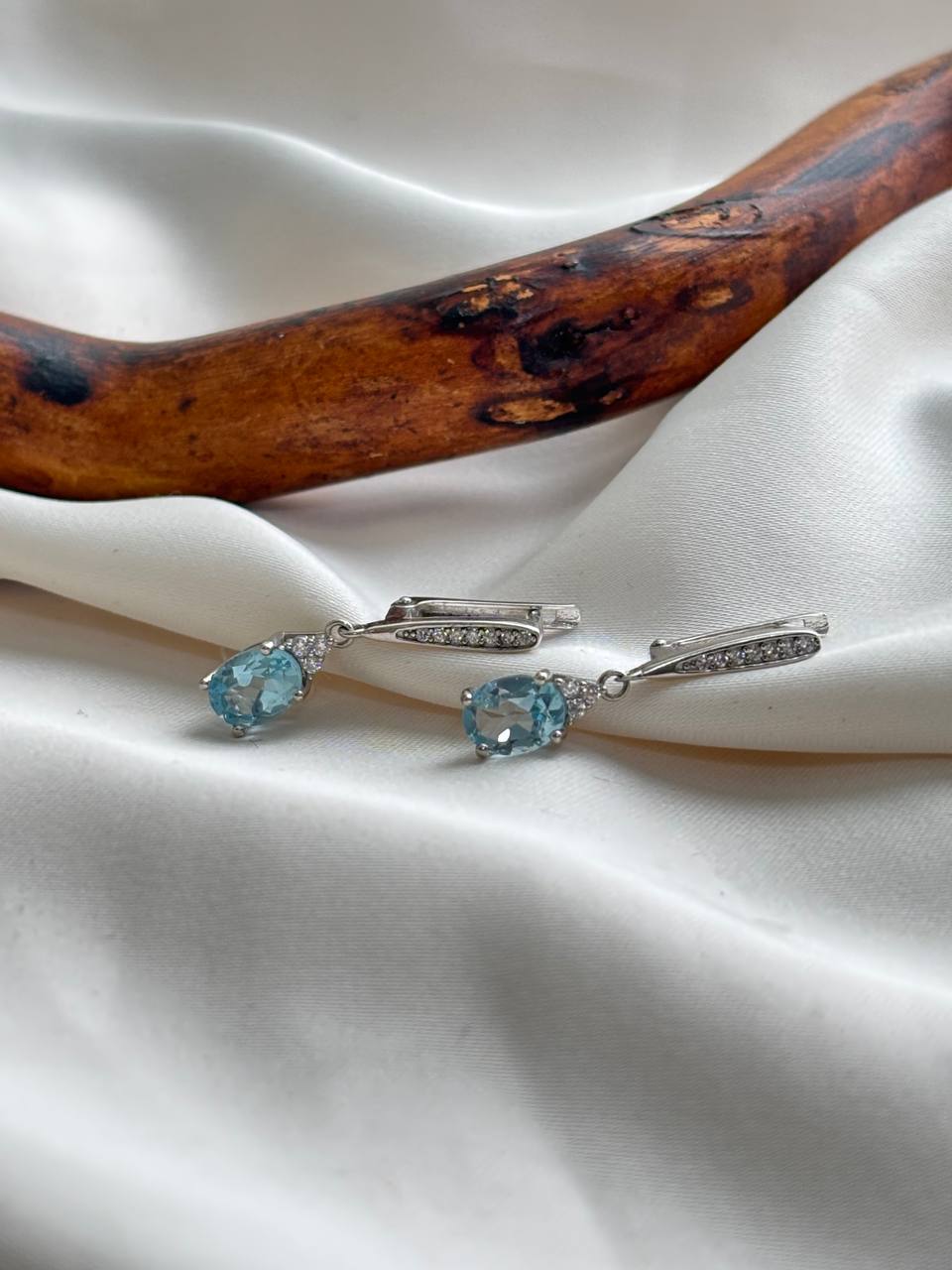Топаз — один из самых известных и почитаемых драгоценных камней, название которого, по одной из версий, происходит от острова Топазиос в Красном море. Голубой топаз — это символ чистоты, ясности и спокойствия. В этих серьгах каждый природный топаз обработан в изысканную овальную форму, которая максимально раскрывает глубину его небесного оттенка и позволяет игре света скользить по гладким граням. В паре с ними выступают фианиты — кристаллы с ярким алмазным блеском, которые выгодно подчёркивают прозрачность и сияние топаза, добавляя украшению праздничный объём и многогранность.