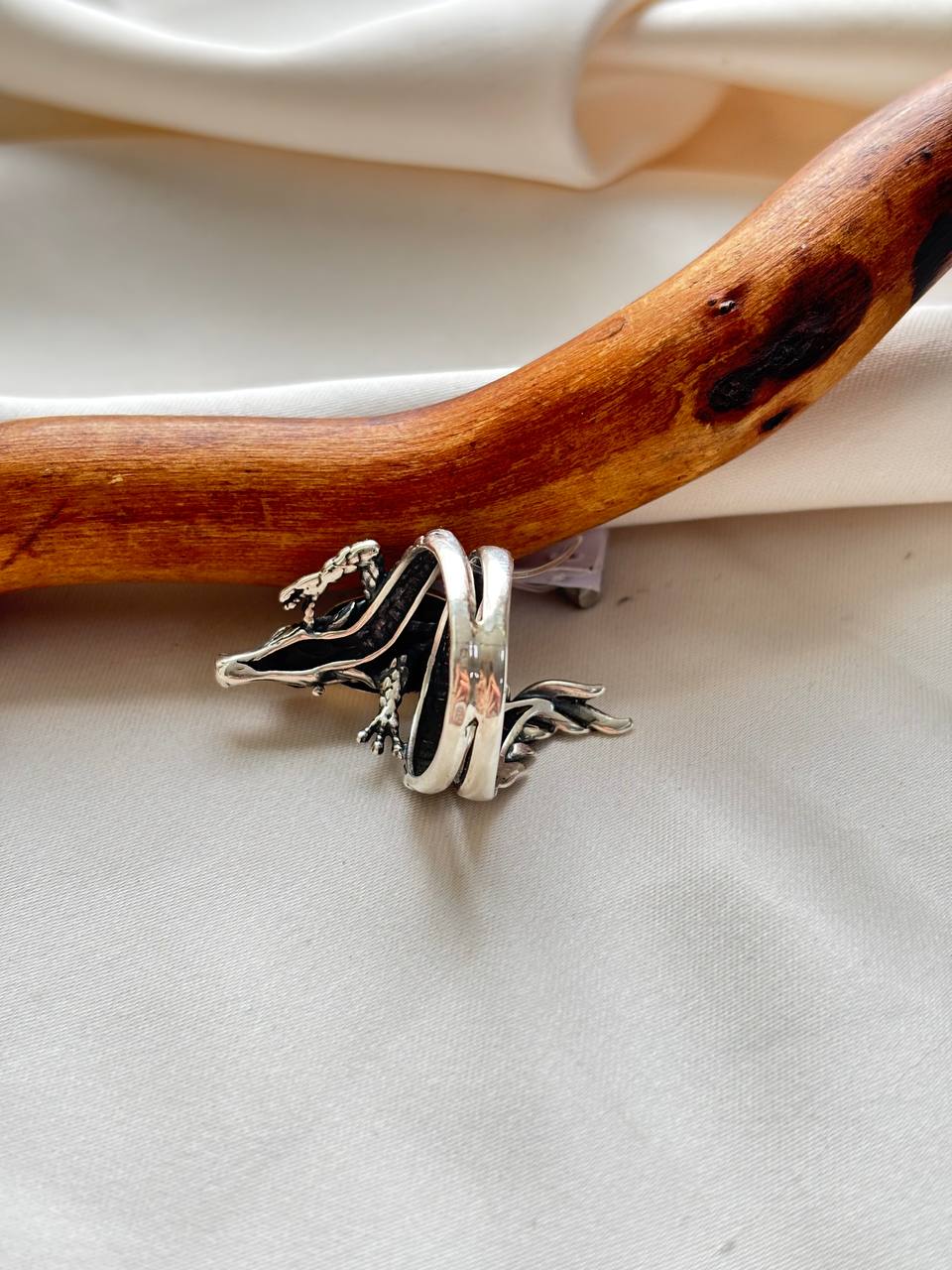 Зелёный турмалин, который специалисты часто называют верделитом, — одна из самых гармоничных и целебных разновидностей этого удивительного минерала. Его глубокий зелёный цвет, от нежного травянистого до насыщенного бутылочного, обусловлен примесями хрома и ванадия. В древности зелёный турмалин считали камнем магов и целителей, способным накапливать и передавать знания. Особенность этого экземпляра — идеальная овальная форма кабошона, которая максимально раскрывает глубину цвета и создаёт эффект мягкого внутреннего свечения. Змея, обвивающая палец, — древнейший символ мудрости, исцеления и бесконечного цикла обновления — выступает не просто как элемент дизайна, а как мифический страж, усиливая природные свойства камня и напоминая о вечном круговороте жизни.